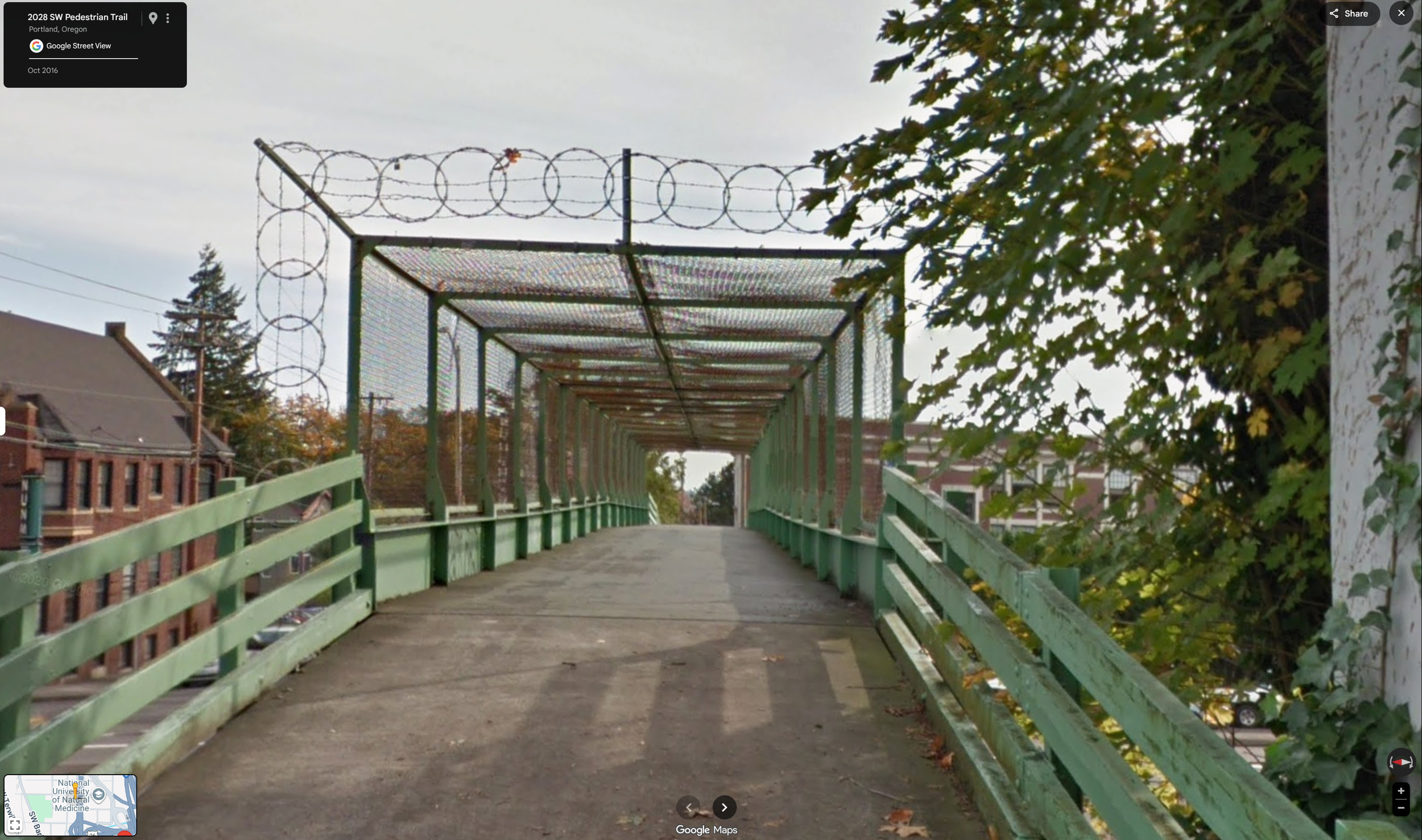 Caged bridge entrance has spiral wire